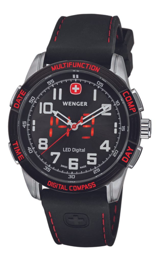 Hodinky Wenger Compass LED Nomad 70430 jsou multifunkční náramkové hodinky s kombinací analogového a digitálního zobrazení času. Pomocí tzv. LED displeje se zobrazuje čas, datum, měsíc, kompas a druhý čas. Černo-červené barevné provedení číselníku dokonale ladí s černým, červeně prošitým řemínkem.