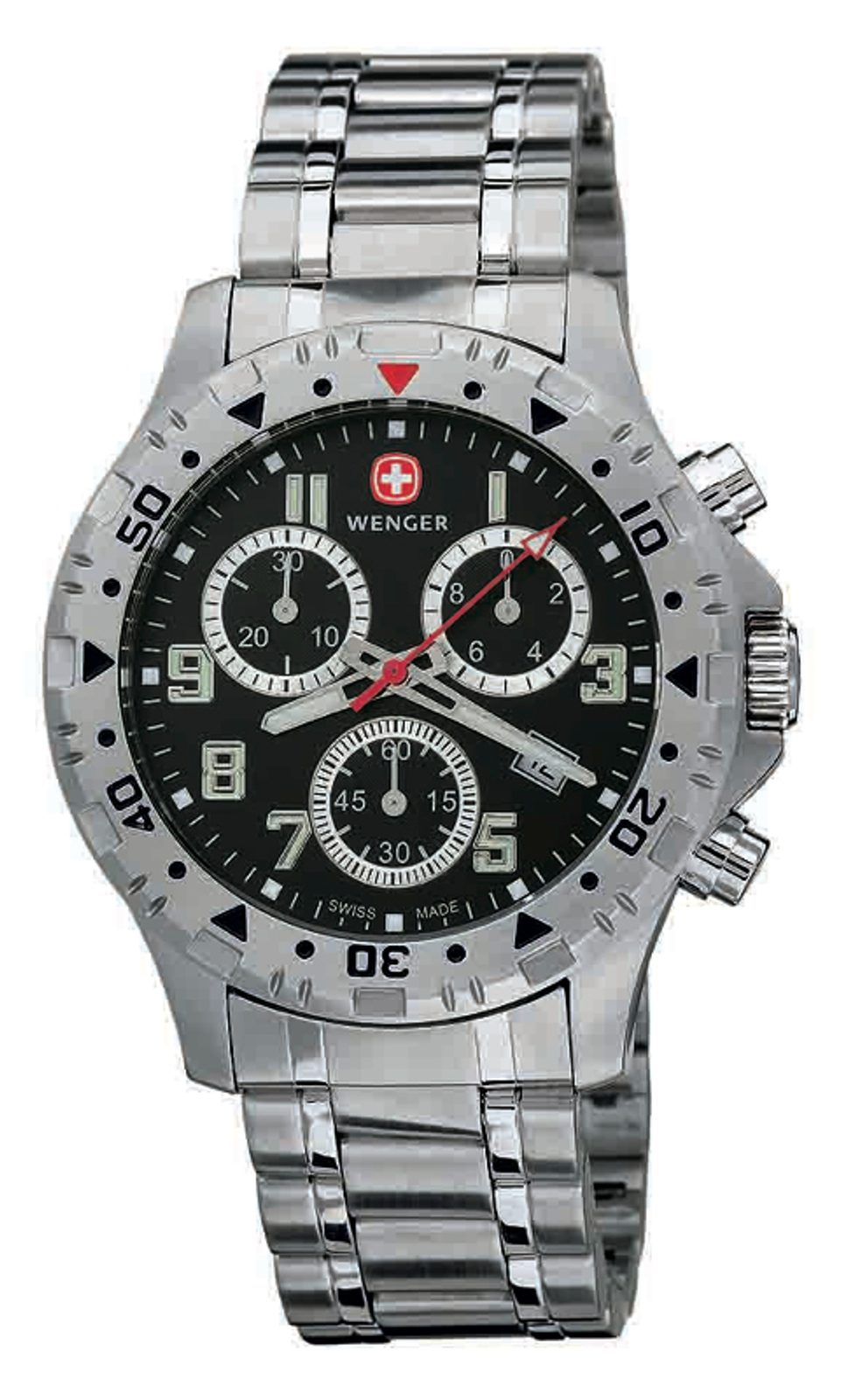 Model Wenger Off Road 79355W v celoocelovém provedení s jednosměrně otočnou lunetou. Tah je v kombinaci matu a lesku. Kromě klasické datumovky disponují hodinky také chronografem a sklíčko je vyrobeno z minerálu se safírovou úpravou.