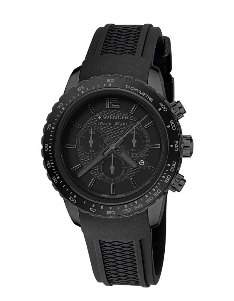 Pánské hodinky Wenger Roadster Black Night Chrono 01.0853.111 jsou jarní novinkou roku 2016 a přináší tak svěží vítr do stávající řady Roadster. Hodinky drží na ruce díky silikonovému řemínku. Ciferník, jenž je chráněn minerálním sklem se safírovou úpravou zaujme velmi elegantním, přehledným provedením. Na čtvrté pozici se nachází ukazatel data. Model dále disponuje stopkami, tachymetrem a pouzdrem černěným PVD úpravou.
