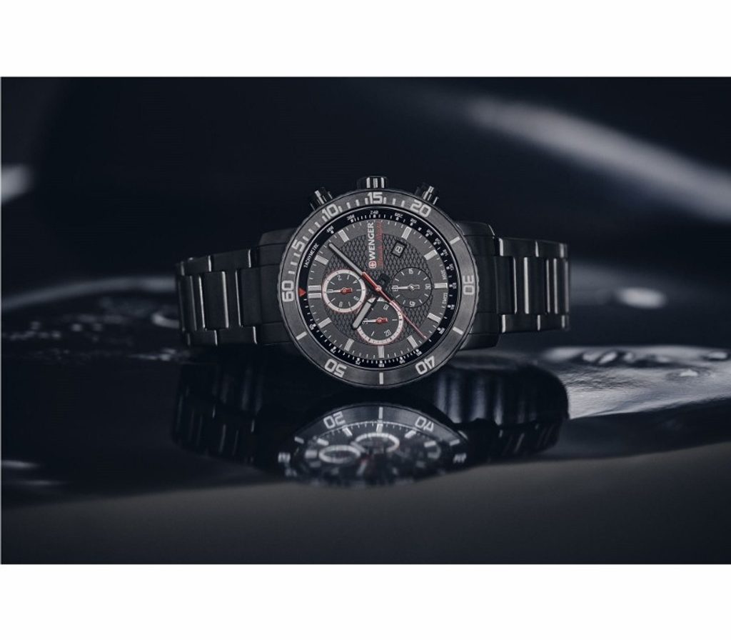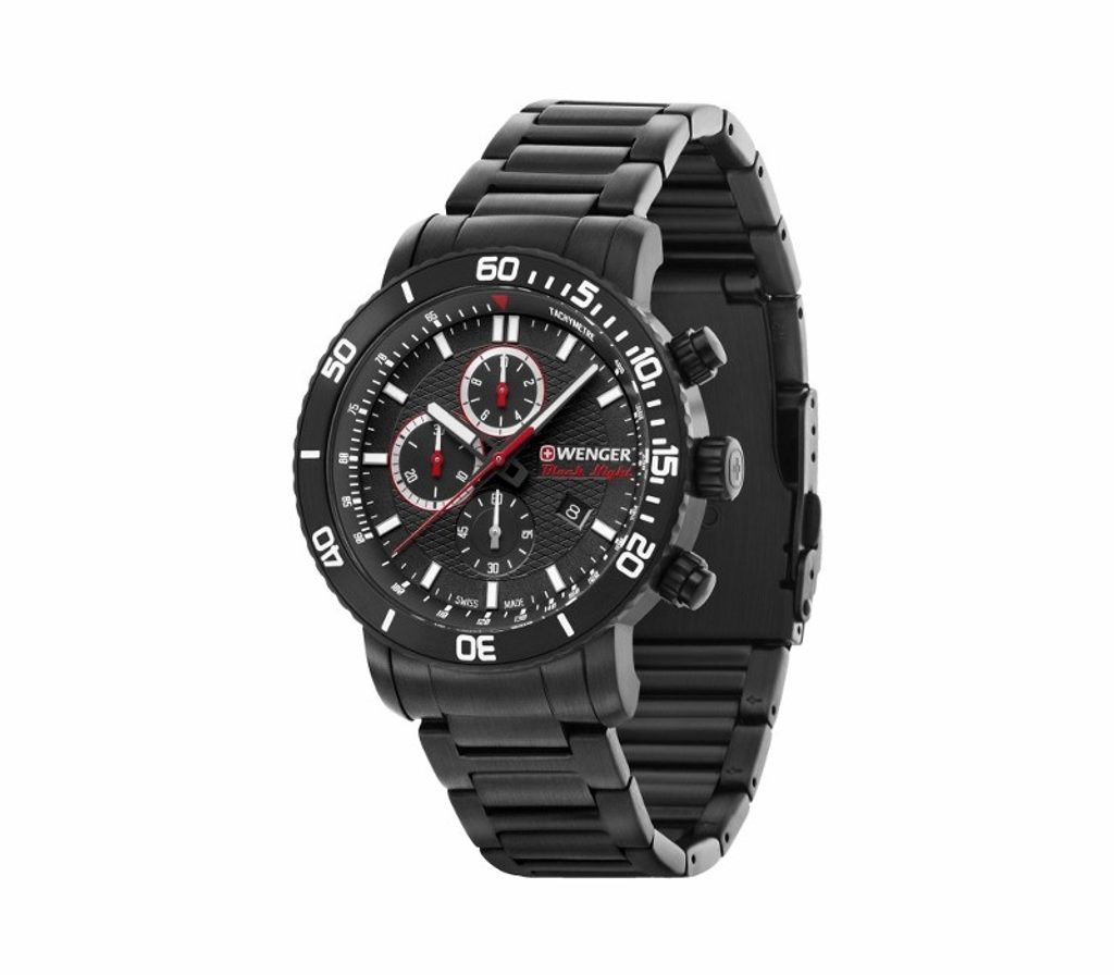Pánské hodinky Wenger Roadster Black Night Chrono 01.1843.110 jsou jarní novinkou roku 2020. Hodinky drží na ruce díky černému řemínku opatřeným PVD vrstvou, ten doléhá až k samotnému pouzdru hodinek. Hodinky z řady Wenger Roadster Black Night mají voděodolnost 100m. Ciferník, jenž je chráněn minerálním sklem se safírovou úpravou se pyšní velmi elegantním, přehledným provedením. Po obvodu ciferníku se nachází černá luneta s tachymetrickou stupnicí. Na čtvrté pozici se nachází ukazatel data. Po obvodu pouzdra hodinek se nacházejí 3 tlačítka. Dva pro potřeby stopek a jeden pro nastavení času a data.