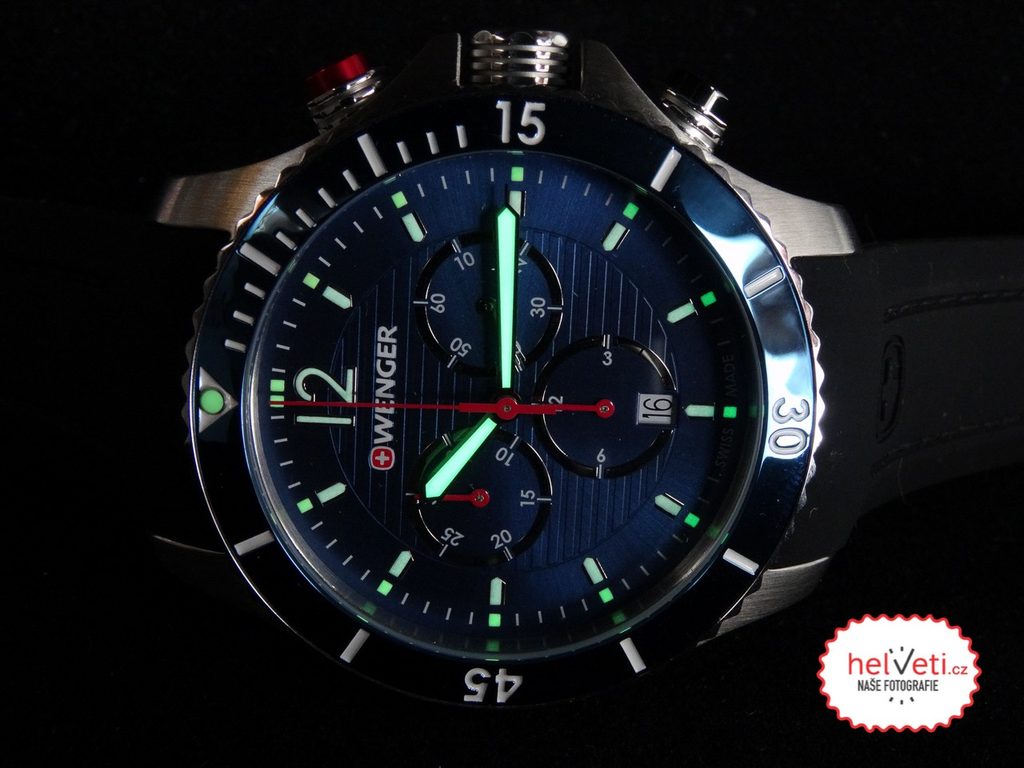 Luminiscence hodinek je jedna z nejvýraznějších z celé řady hodinek Wenger. Silný nátěr SuperLuminovy je na indexech, ručičkách a výchozím bodě otočné lunety.