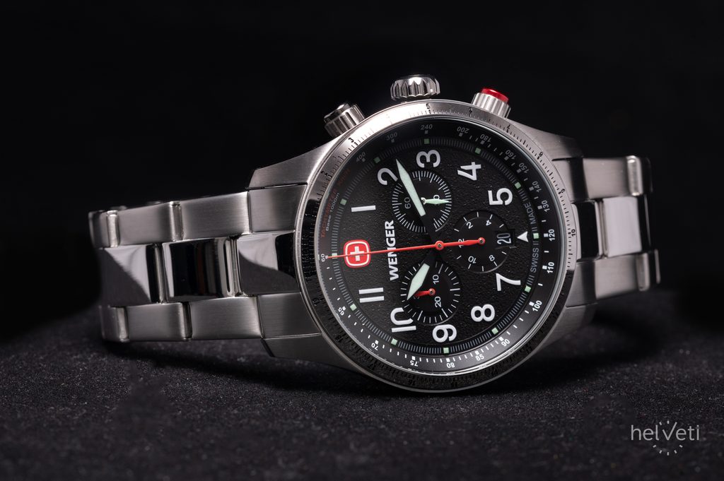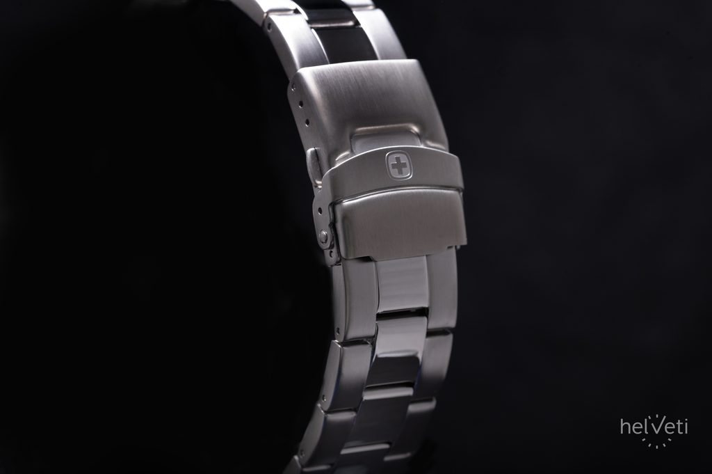 Hodinky budou držet na Vašem zápěstí díky ocelovému náramku. Snadnou výměnu řemínků zajišťuje systém uchycení pomocí rychlostěžejek. Za zmínku také stojí vygravírovaná signovaná korunka se Švýcarským křížem umístěna klasicky na pravé straně pouzdra. Jak již jsme u Wengeru zvyklí, i zde se myslí na praktickou stránku věci, a hodinky tedy mají vodotěsnost 10 ATM. Díky této vodotěsnosti se s hodinkami nemusíte jít bát zaplavat.