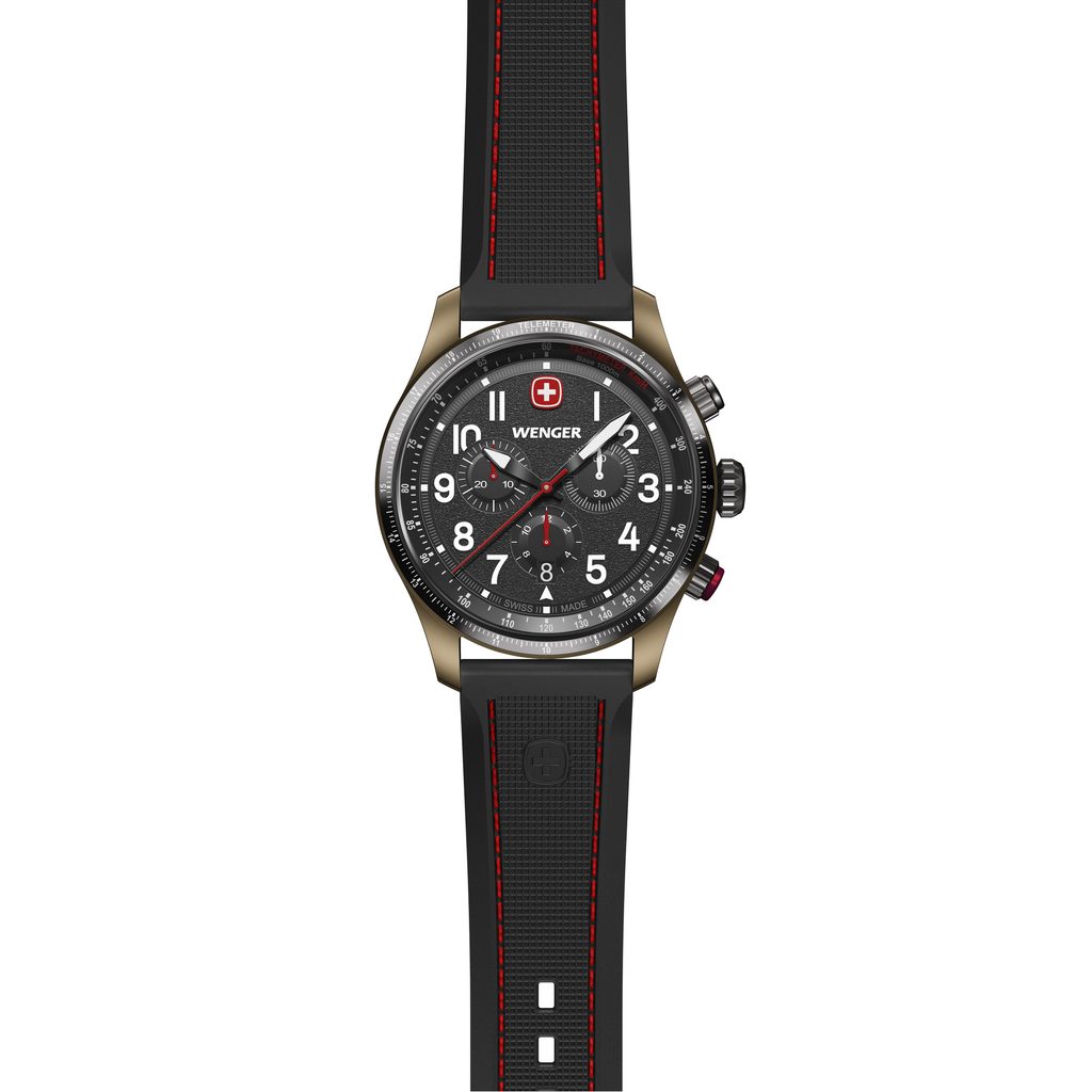 Hodinky budou držet na Vašem zápěstí díky silikonovému řemínku. Snadnou výměnu řemínků zajišťuje systém uchycení pomocí rychlostěžejek. Za zmínku také stojí vygravírovaná signovaná korunka se Švýcarským křížem umístěna klasicky na pravé straně pouzdra. Jak již jsme u Wengeru zvyklí, i zde se myslí na praktickou stránku věci, a hodinky tedy mají vodotěsnost 10 ATM. Díky této vodotěsnosti se s hodinkami nemusíte jít bát zaplavat.