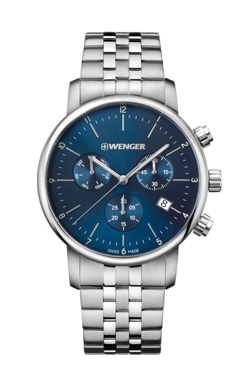Společensky laděné hodinky Wenger Urban Classic Chrono 01.1743.105 mají přehledný ciferník, který obsahuje ukazatel data, dne v týdnu a stopky. Hodinky z řady Wenger Urban Classic mají voděodolnost 100m a minerální sklíčko se safírovou úpravou. Pouzdro a tah hodinek je vyrobeno z oceli. Hodinky mají švýcarský strojek Ronda Z60, který pohání baterie.