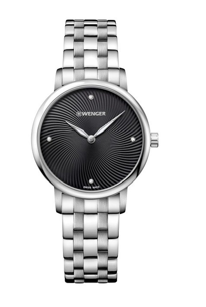 Dámské náramkové hodinky z nově představené modelové Urban Donnissima. Hodinky Wenger Urban Donnissima 01.1721.105 se hodí na každodenní nošení ale i do společnosti. Ciferník Vás na první pohled zaujme plastickým zpracováním. Hodinky disponují ocelovým pouzdrem a luminiscenčními ručičkami. Vodotěsnost tohoto modelu je 100m. V této cenové kategorii oceníte minerální sklíčko potažené safírovou vrstvou. Náramek ve stříbrné barvě skvěle padne k černému ciferníku, na kterém se nacházejí 4 Swarovski krystaly.