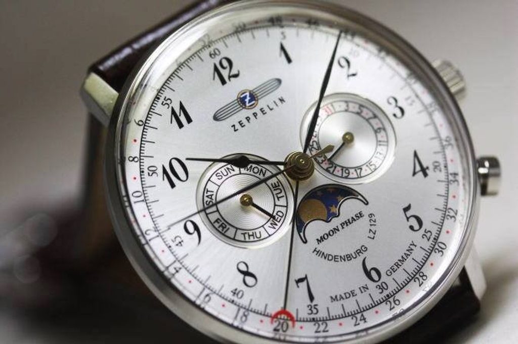 Hodinky Zeppelin 7036-1 patřící do modelové řady LZ Hindenburg Ed. 2 nabízí vedle již zmíněného ukazatele měsíční fáze také ukazatel data v subciferníku na 3. pozici. Na opačné straně ciferníku je k vidění ukazatel dne v týdnu. Ručička zakončená půlměsícem signalizuje po vnitřní lunetě na aktuální kalendářní týden. Na atraktivitě modelu přidává vypouklé sklíčko, jenž je vyrobeno ze speciálního tvrzeného plastu, tzv. Hesalitu.