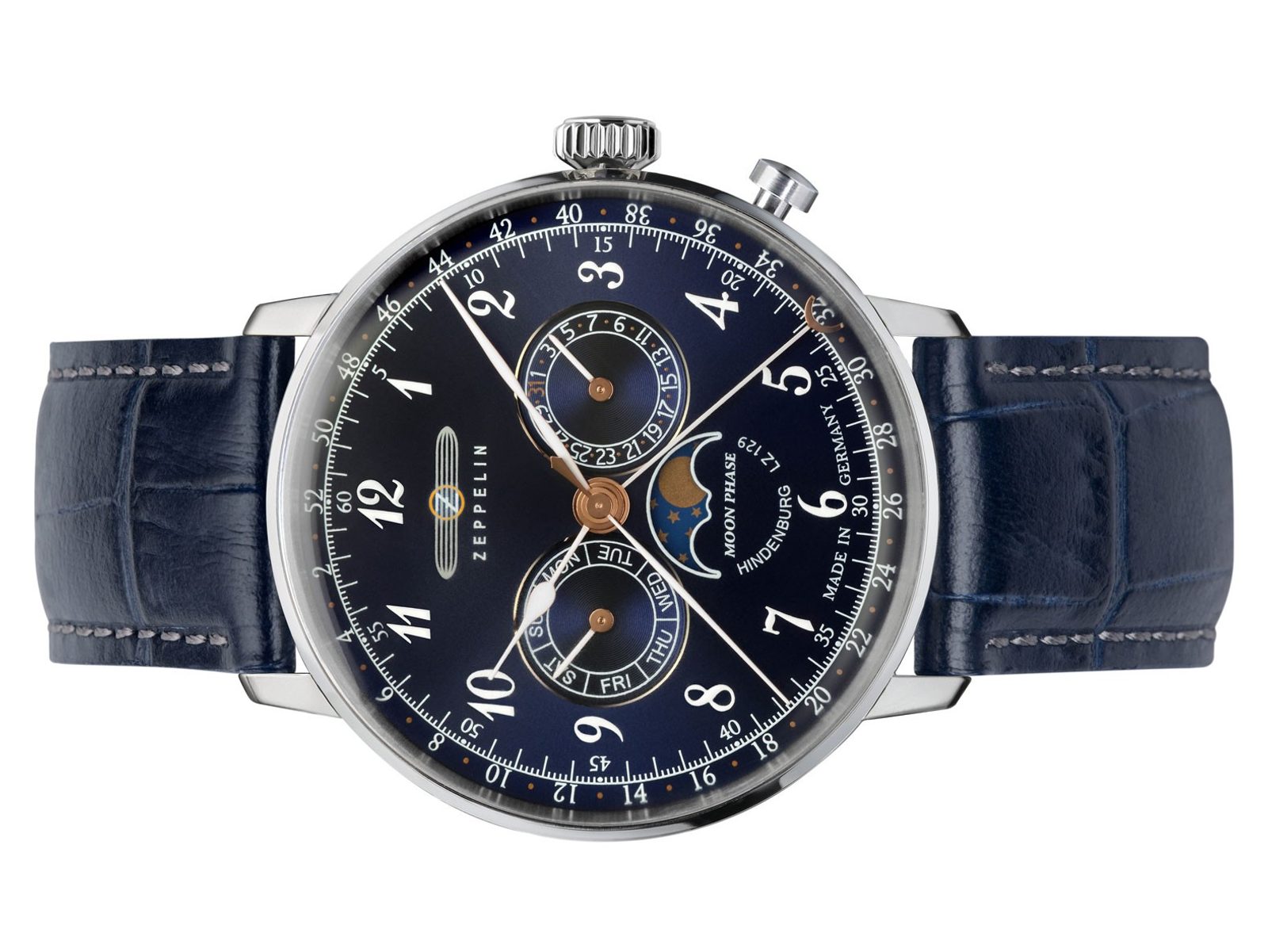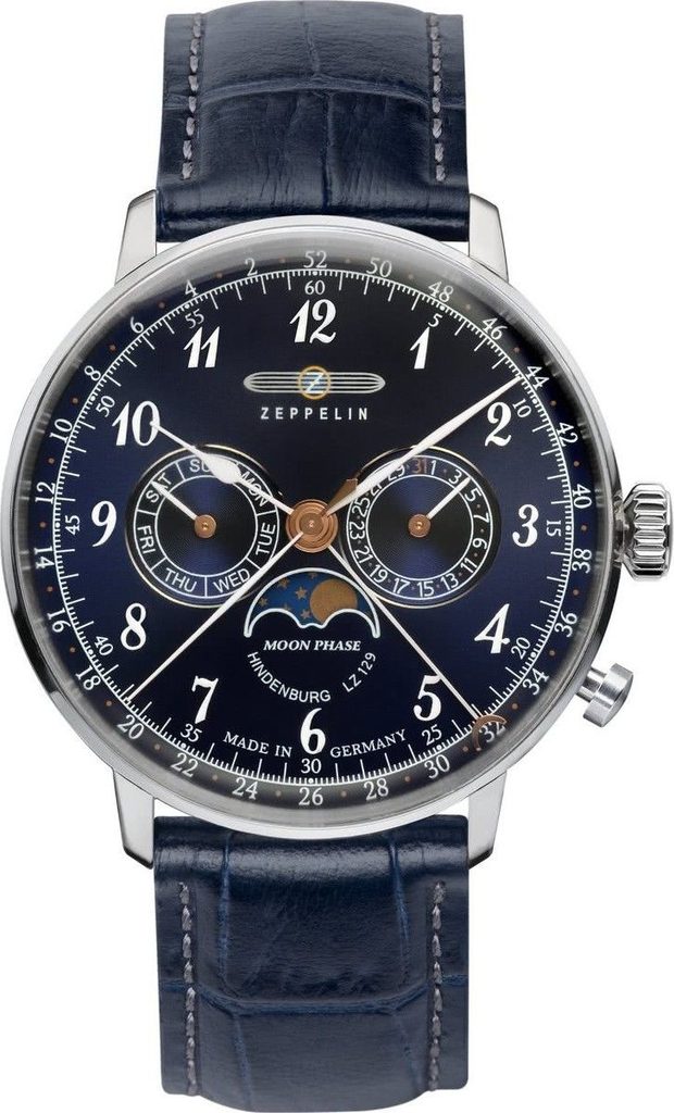 Model Zeppelin LZ 129 Hindenburg Moonphase 7036-3 skvěle kombinuje letecký styl hodinek s elegantním. Hodinky navíc zaujmou bohatou nabídkou funkcí, ze kterých vyniká zejména stále oblíbenější ukazatel měsíční fáze.
