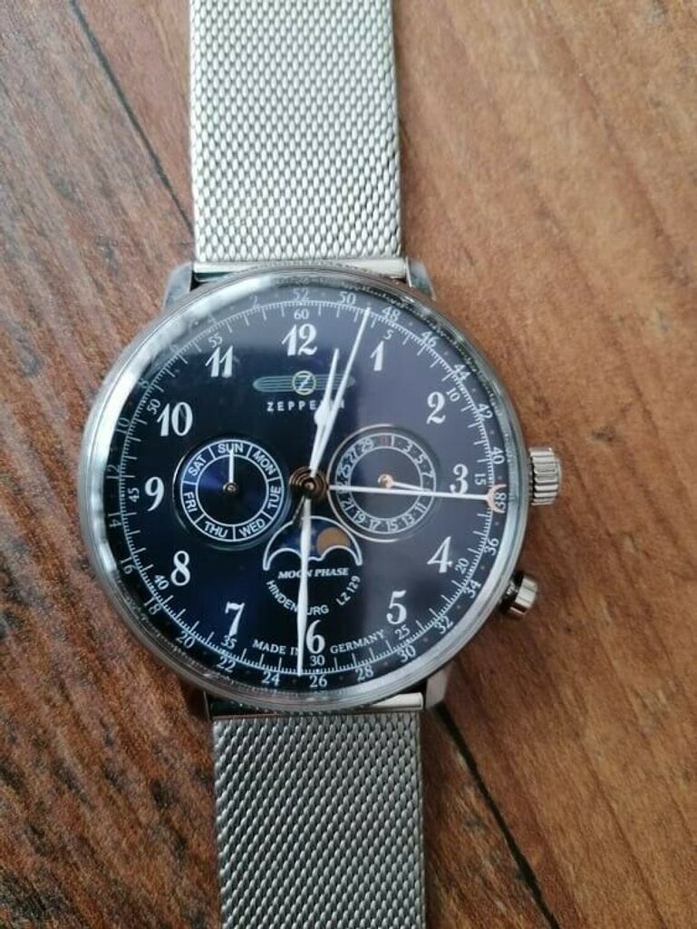Hodinky Zeppelin 7036M-3 patřící do modelové řady LZ Hindenburg Ed. 2 nabízí vedle již zmíněného ukazatele měsíční fáze také ukazatel data v subciferníku na 3. pozici. Na opačné straně ciferníku je k vidění ukazatel dne v týdnu. Ručička zakončená půlměsícem signalizuje po vnitřní lunetě na aktuální kalendářní týden. Na atraktivitě modelu přidává vypouklé sklíčko, jenž je vyrobeno ze speciálního tvrzeného plastu, tzv. Hesalitu.