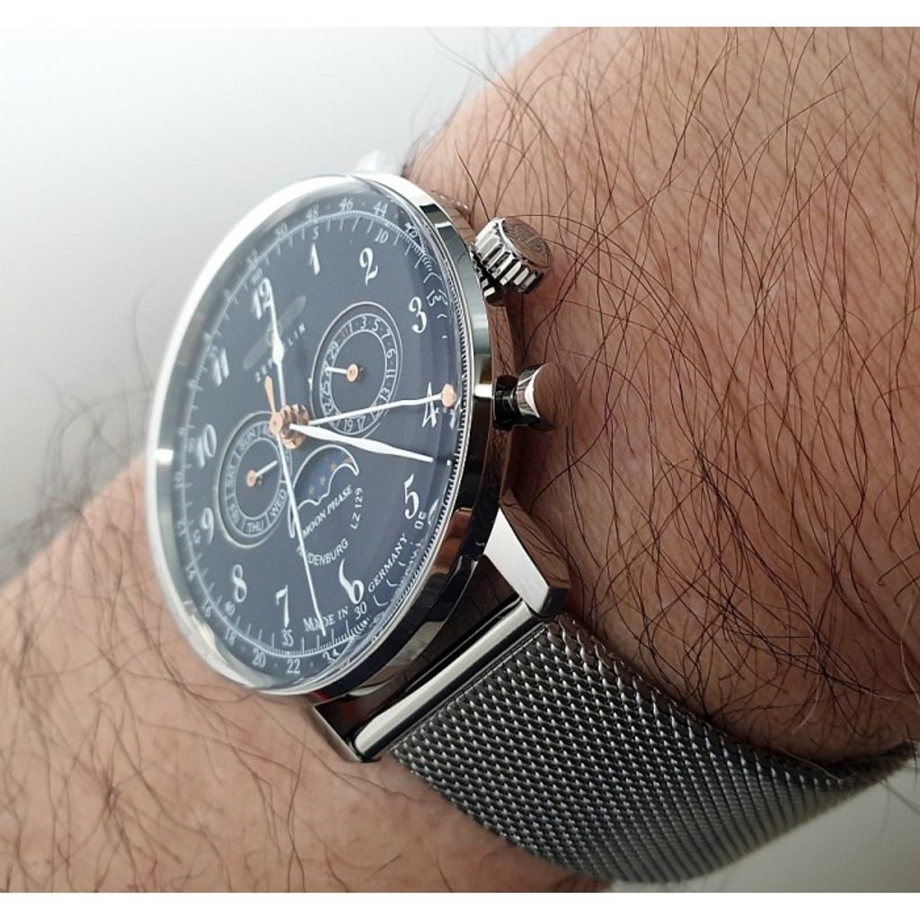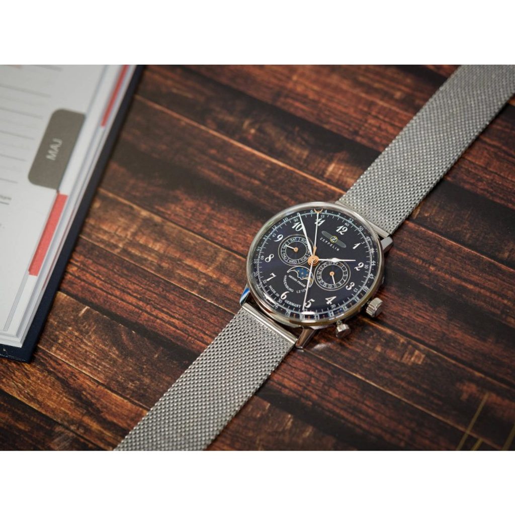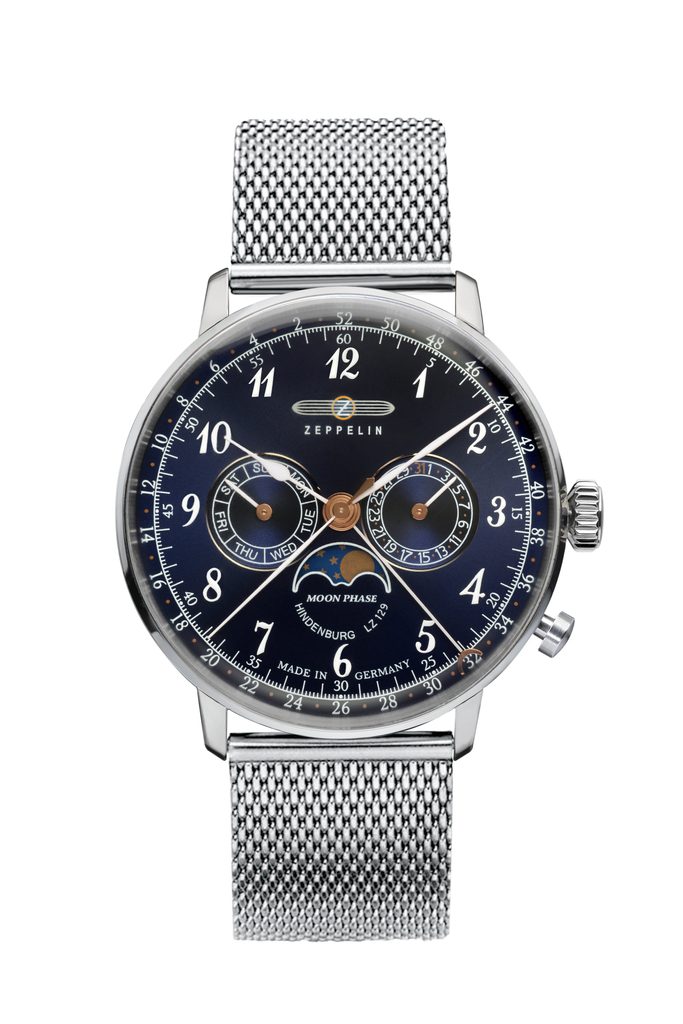 Model Zeppelin 7036M-3 skvěle kombinuje letecký styl hodinek s elegantním. Hodinky navíc zaujmou bohatou nabídkou funkcí, ze kterých vyniká zejména stále oblíbenější ukazatel měsíční fáze.