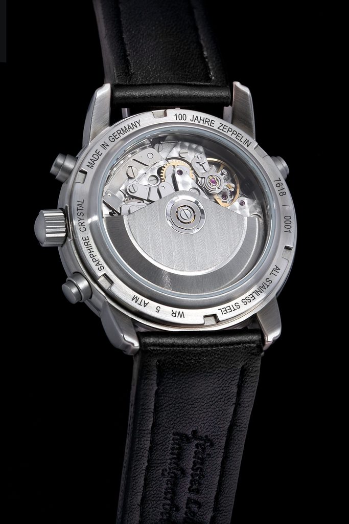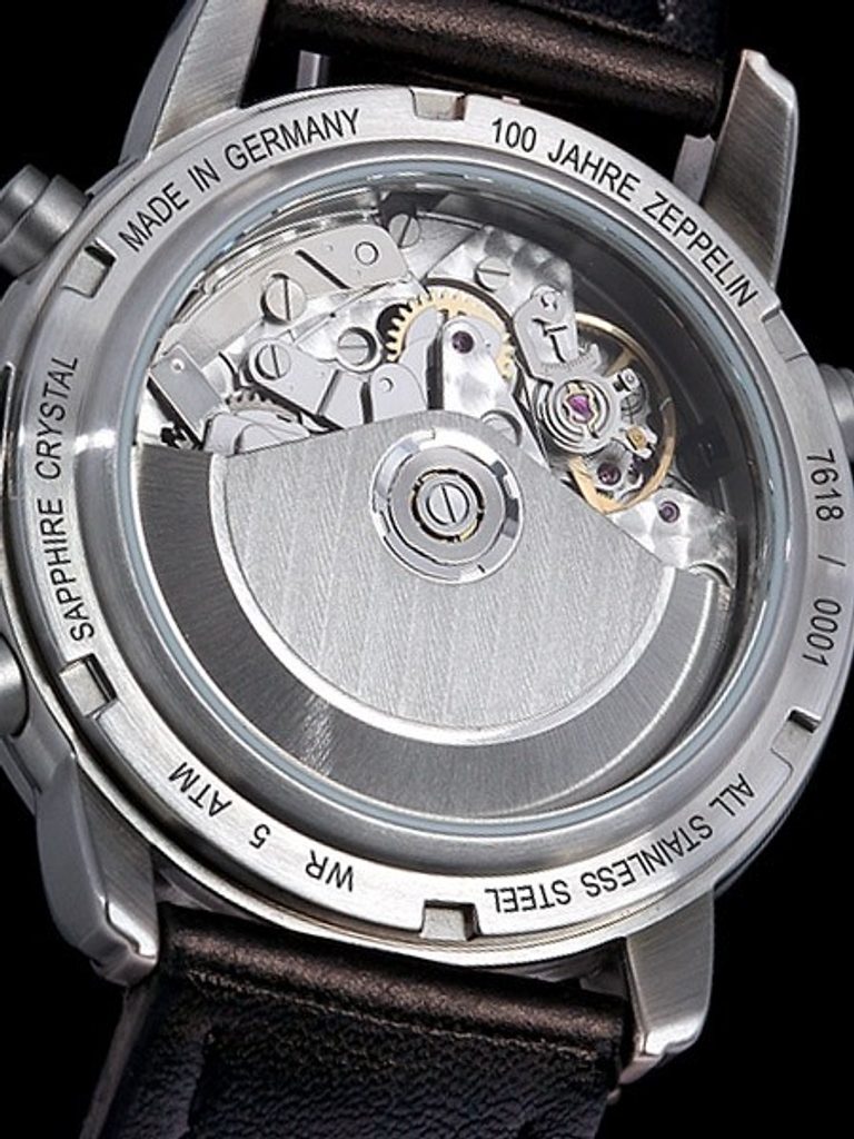 Hodinky Zeppelin 7618-1 z kolekce 100 Years Zeppelin Edition 1 jsou vybaveny ukazatelem data, stopkami, tachymetrem a telemetrem. Ukazatel data se nachází mezi 4. a 5. hodinou. Velká centrální ručka slouží jako vteřinová po spuštění stopek. Subciferník na 3. pozici slouží jako 30-ti minutový čítač pro stopky. Na 6. pozici je poté subciferník s možností stopovat až po dobu 12 hodin. U deváté hodiny se nachází běžná vteřinová ručička. Telemetr, jenž je k vidění po vnitřní lunetě hodinek, slouží pro měření vzdálenosti. Měření funguje na základě rychlosti zvuku. Švýcarský mechanický strojek ETA Valjoux 7753 nabízí také možnost rychlého posunu data pomocí tlačítka na pozici 10.